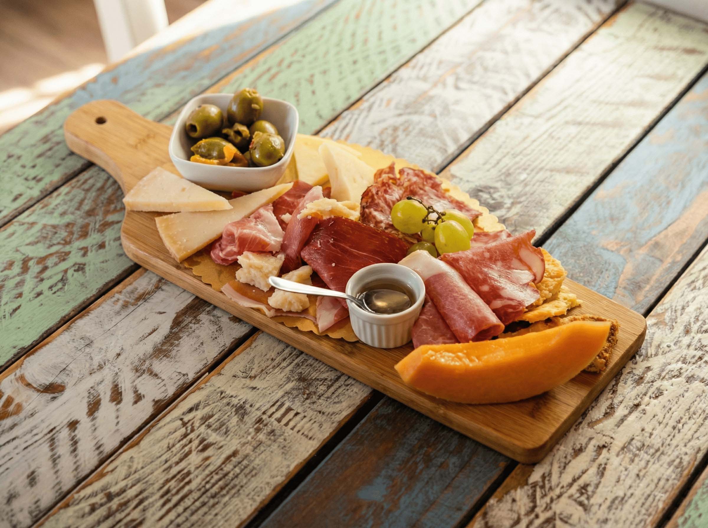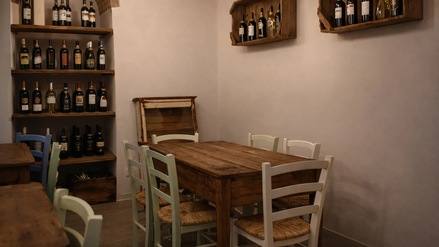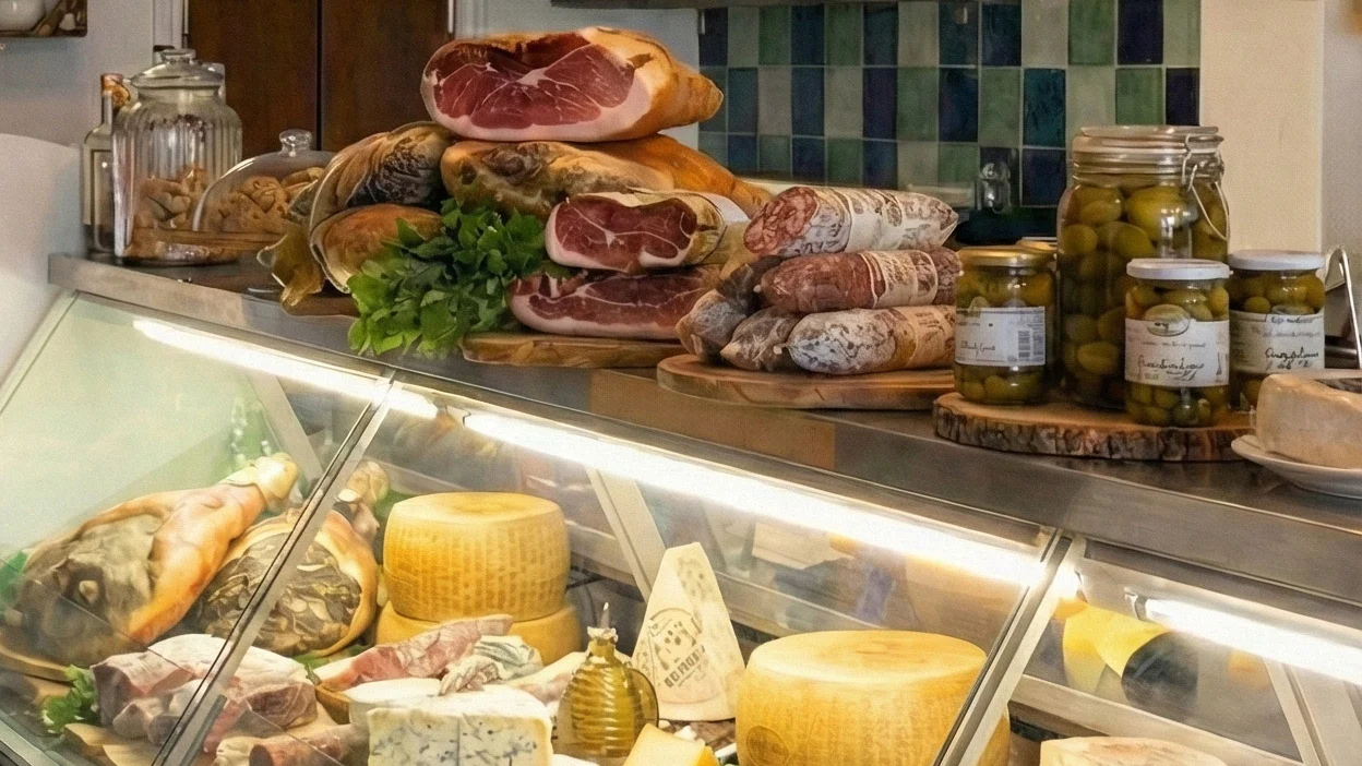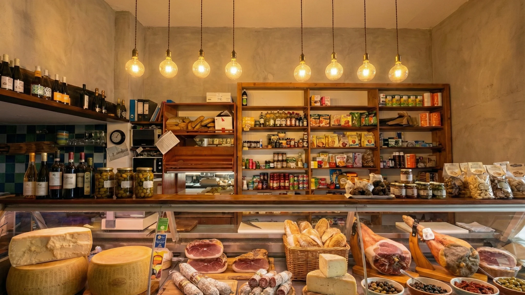 La Cisterna nasce come alimentari di paese e continua a esserlo ancora oggi: scaffali con prodotti del territorio, un banco salumi e formaggi, e un’idea chiara di ospitalità